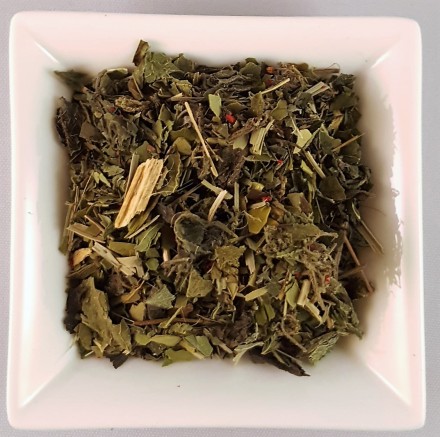 Zutaten: Matetee, Brennesselblätter, Melissenblätter, Brombeerblätter, Pfefferminzblätter, Krauseminze, Granatapfelblüten.