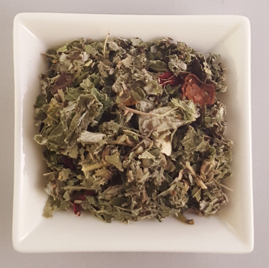 Zutaten: Himbeerblätter, Hagebuttenschalen, Brombeerblätter, Zitronenschalen, Apfel, Hibiskusblüten, Verveine.