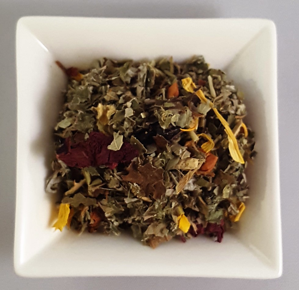 Zutaten: Brombeerblätter, Himbeerblätter, Hagebutte, Ringelblumenblüten, Eibisch, Rosenblüten, Süßholzwurzel, Sonnenblumenblüten, Klatschmohnblüten.