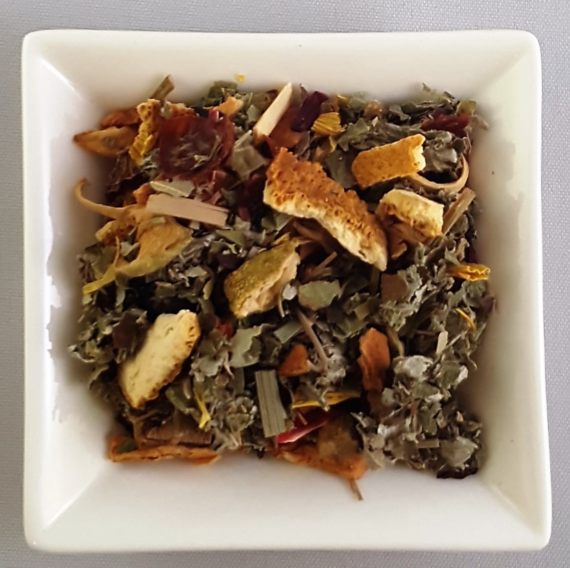 Zutaten: Brombeerblätter, Apfel, Hagebuttenschalen, Hibiskusblüten, Himbeerblätter, Orangenschalen, Orangenblüten, Süßholzwurzel, Zitronenschalen, Zitronengras, Matetee, Aroinabeeren, Sonnenblumenblüten, Ringelblumenblüten, Malvenblüten, Pfefferminze.