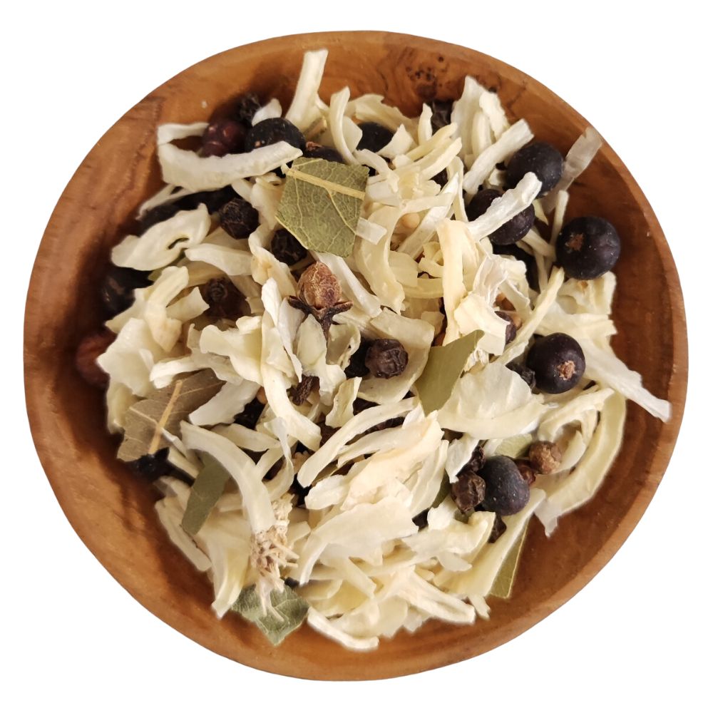 Zutaten: SENFKÖRNER, Zwiebel, Pfeffer, Wacholderbeeren., Lorbeerlaub, Nelken.