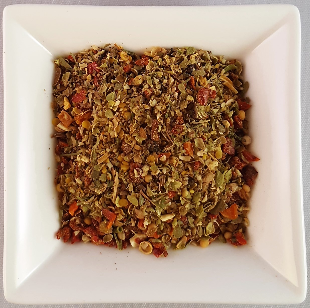 Zutaten: Paprika, SENFKÖRNER, Oregano, Suppengewürzmischung (Zutaten: Karotten, Pastinaken, Petersilie, Porree, SELLERIE), Zwiebel, Koriander, Kümmel, Pfeffer, Knoblauch, Basilikum, Wacholderbeeren, Piment, Chilli. [kann Spuren von SESAM enthalten]