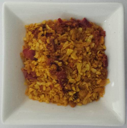 Zutaten: Zwiebel, Röstzwiebel (Zwiebeln (76%), pflanzlichesÖl, WEIZENMEHL, Salz), Paprika, Knoblauch, Pfeffer, Curry (Curcuma, Zwiebel, Knoblauch, SENF, Chillie, Coriander, Cumin, Ingwer, Bockshornkleesaat, Pfeffer, Salz, Fenchel.), Curcuma.