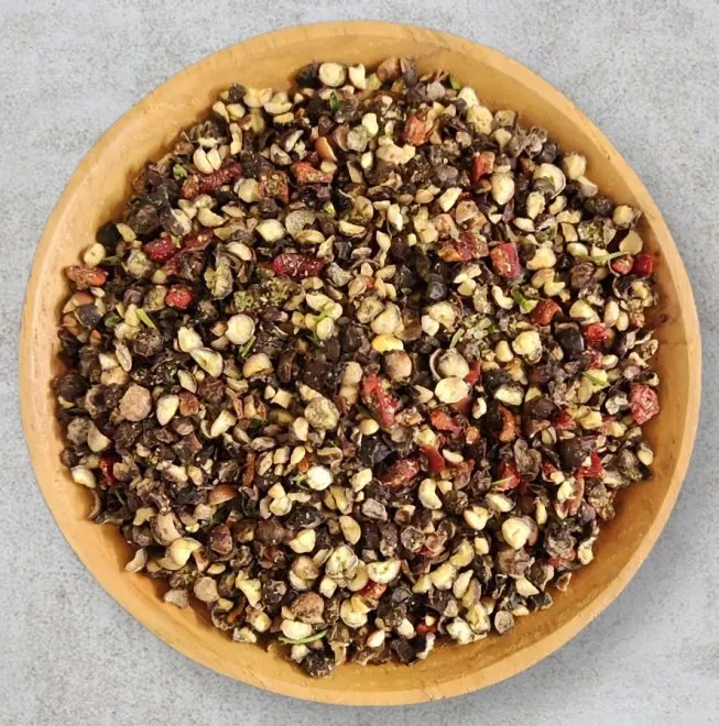Zutaten: Pfeffer, Meersalz, Knoblauch, Zwiebel, Paprika, Invertzucker, Petersilie, Piment, Basilikum, Thymian, Aroma, Sonnenblumenöl. [kann Spuren von Senf, Sellerie & Sesam enthalten]