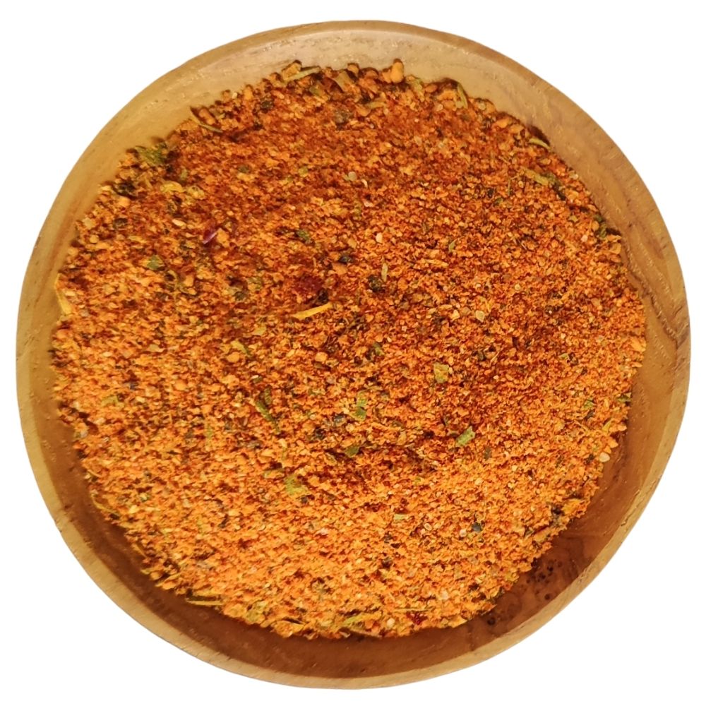 Zutaten: Pfeffer, Paprika, Senfmehl, Curry (Curcuma, Zwiebel, Knoblauch, Senfmehl, Cumin, Chillies, Ingwer, Koriander, Bockshornkleesamen, Pfeffer, Meersalz, Fenchel, Meersalz, Zwiebel, Knoblauch, Tomatenpulver, Curcuma, Zucker, Petersilienblätter, Muskat, Schnittlauch, Majoran, Thymian, Basilikum. [kann Spuren von Sellerie & Sesam enthalten]