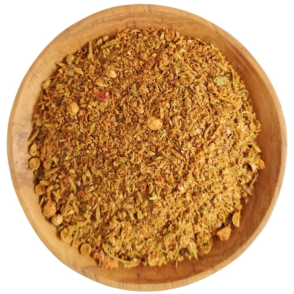 Zutaten: Gewürze (Koriander, Kreuzkümmel, Chili, Pfeffer, Thymian, Petersilie, Muskat, Kümmel, Kurkuma, Zimt, Ingwer, Pimentkörner, Zwiebel, SENFKÖRNER, Zwiebel, Knoblauch, Kardamom, Lorbeerblätter), 11% Steinsalz, Roh-Rohrzucker. [kann Spuren von SELLERIE & SESAM enthalten]